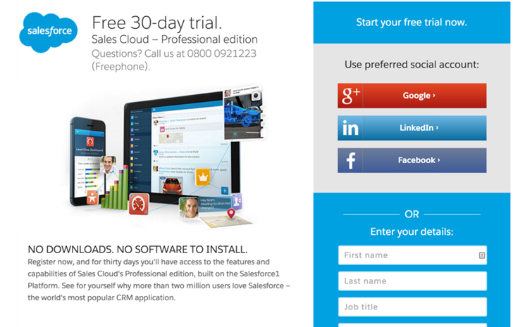 The bold blue and white design of Salesforce’s free trial sign-up isn’t the prettiest form you’ll ever see, but it doesn’t let anything else hog the limelight.