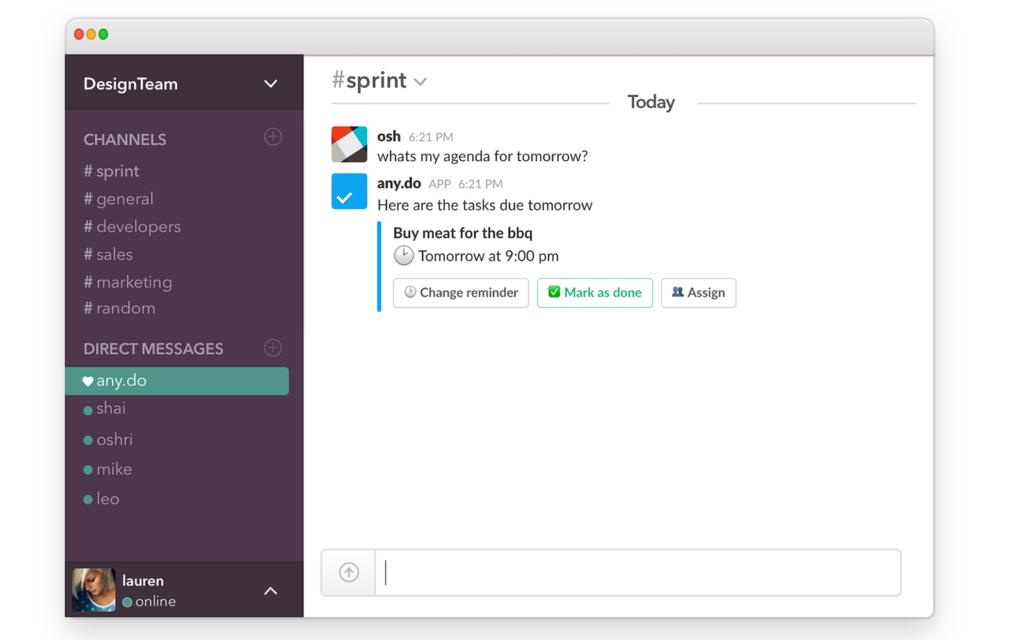 The Any.do for Slack app comes with two modes: a Multiplayer mode that uses a group channel in Slack and a Singleplayer mode that creates a private channel for your personal tasks.