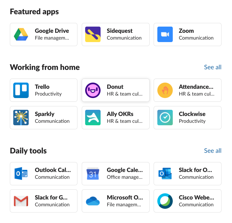 | Donut | Team management | Build relationships & boost morale between remote workers |