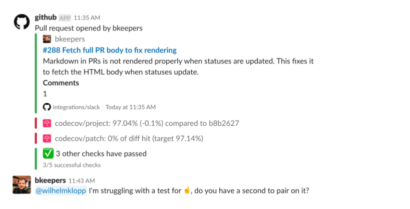 The GitHub for Slack app allows you to choose which events you’re notified about, depending on your role within a project. For example, you’ll be notified about issues, pull, statuses, commits and deployments by default and you can also add notifications for reviews, comments and branches – among others.