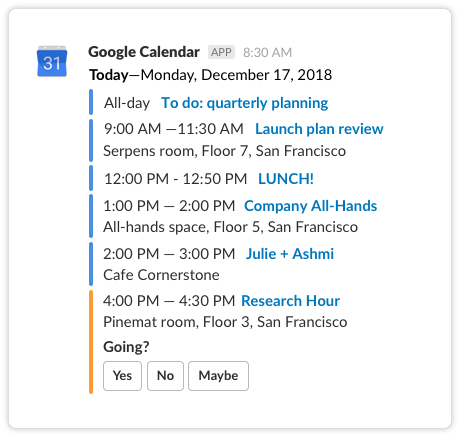 - Fully-synced: Meetings arranged in Slack are automatically added to team members’ calendars.