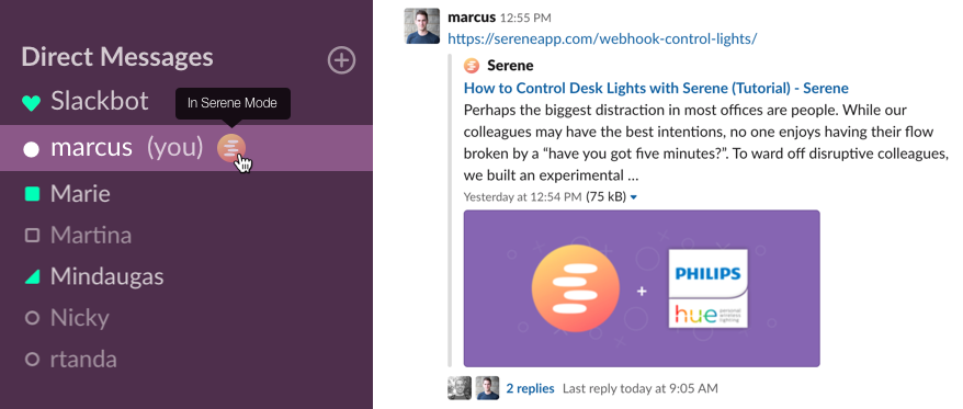 Zapier allows you to do this by connecting Slack and Serene so that your status shows colleagues that you’re busy by displaying a Serene emoji icon next to your unavailable status.
