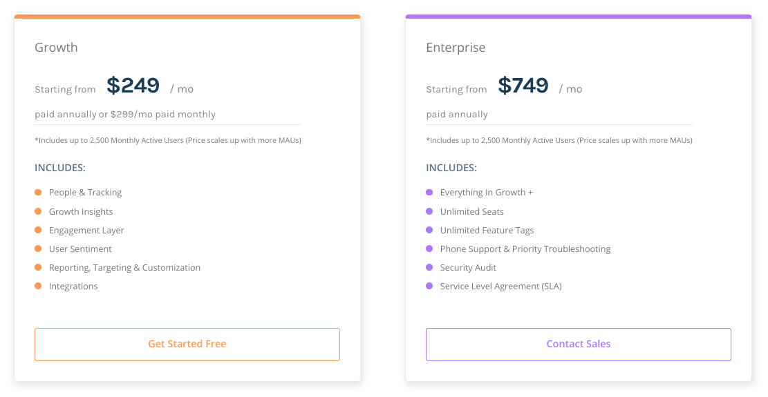 Userpilot pricing starts at $249/month for the Growth plan (there’s no free plan available) while pricing for the Enterprise plan starts at $749/month.