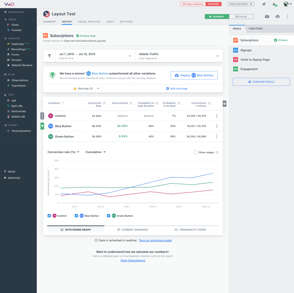 With VWO, you have separate products for optimising websites and software products so you can use either or both, depending on your needs. In our experience, VWO provides the best balance of quality, depth of features and value/affordability. It sits on that line between enterprise-grade software and products designed for growing businesses, which is reflected in the pricing and the intuitive experience.