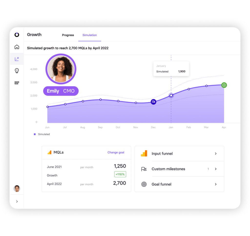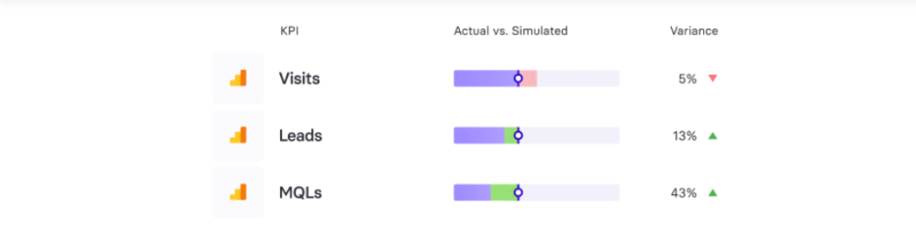 TrueNorth allows you to test campaign ideas to see what works before you put any resources on the line. The platform helps you set achievable marketing goals and test multiple campaign ideas to see which creatives give you the best return for your marketing spend. For example, you can set a goal of increasing marketing qualified leads (MQLs) by 115% by the start of April 2022 and simulate campaign ideas to achieve this. TrueNorth shows you which objectives you’ll need to complete along the way (visits, conversions, leads, etc.) to achieve this goal with performance breakdowns for every month.