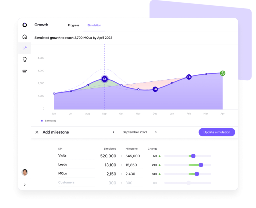 This helps us to hit smaller targets every month and stay on track with our primary goals while remaining agile enough to respond to external factors. With milestones, we’re also able to see where performance deviates from predictions sooner and respond to changes faster. If we’re falling short of the simulation, we can shuffle resources and come up with a plan that will still achieve our goal in time. Likewise, if we’re over-performing during the first few months of a campaign, we can adjust our forecast to set higher targets and measure ongoing performance to see how it compares to both predictions.